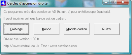 Cette version est adaptée aux montures équatoriales et imprime soit des bandes graduées en AD (h, min, s) ou des cadrans gradués en degrés.