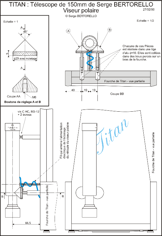 Il est conseillé d’installer le viseur sur un bras de la fourche du télescope et (ne pas le placer dans l’axe horaire comme c’est souvent le cas sur les petits instruments du commerce. En effet, ce viseur doit être influencé par les principales flexions de la monture. Sur une monture à fourche ou sur une monture allemande, l’axe horaire est en porte-à-faux et peut avoir des flexions de plusieurs dizaines de minutes d’arc. En conséquence, l’instrument semble tourner autour d’un axe légèrement différent.)