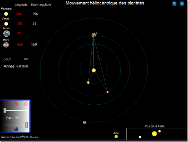Cette application très didactique amènera nos élèves à comprendre le mouvement des planètes dans le système solaire et plus particulièrement le mouvement rétrograde des planètes dans le ciel.
