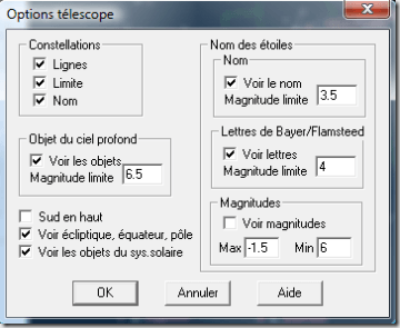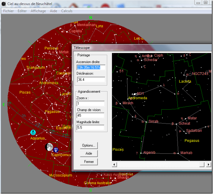 Le mode Ciel qui montre l’état du ciel. Un clic sur un point du ciel ouvre la fenêtre Télescope qui met de zoomer sur la zône. L’ensemble est bien paramétrable.