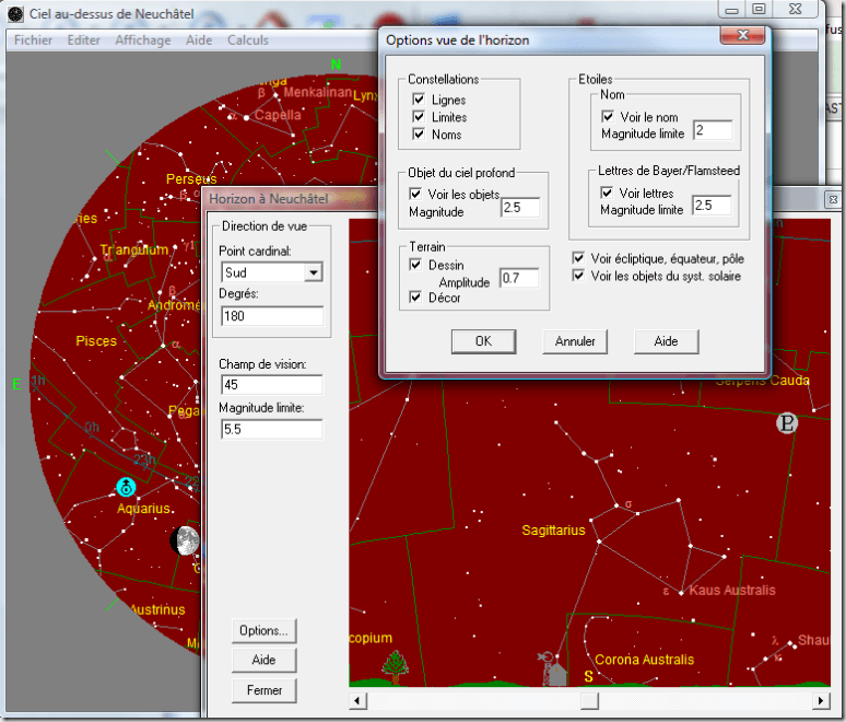 Le mode Horizon affiche l’horizon du lieu en cours et offre encore un paramétrage important.