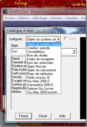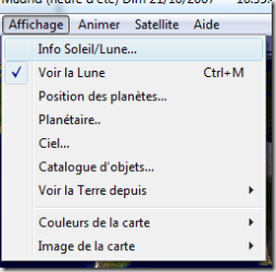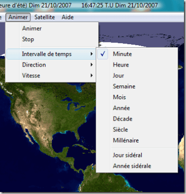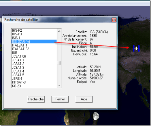Enfin le menu Satellite permet de suivre un satellite particulier (ici l’ISS)
