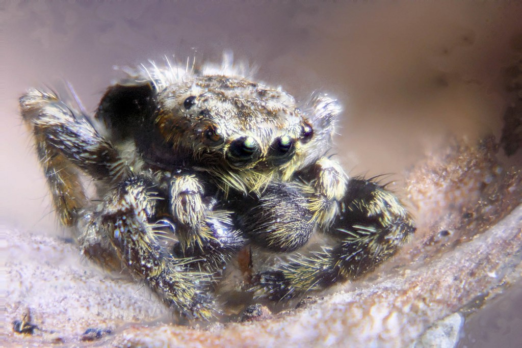2ème essai cette fois encore plus grossi sur une toute petite araignée : Lumix TZ100 + Bonnette +4 + Raynox 250 + Raynox 150 en post focus
