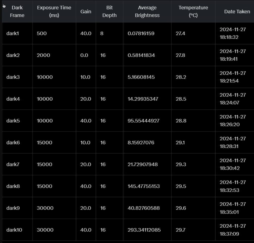 Voici donc la liste des darks réglés en usine, il n’y en a pas d’autres. Il est vivement conseillé de reprendre des darks à la bonne température.