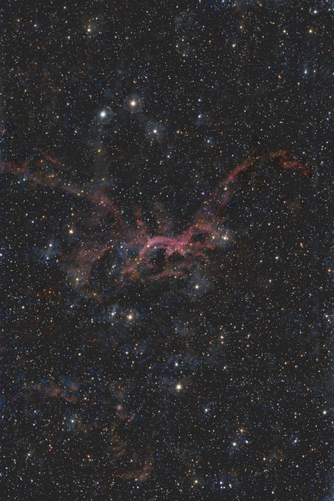 Sh2-114 est un nuage très peu étudié au-delà de son simple catalogage, d’apparence filamenteuse et apparemment composé de plusieurs filaments arqués superposés. Elle a une forme de demi-cercle avec la concavité orientée vers le sud