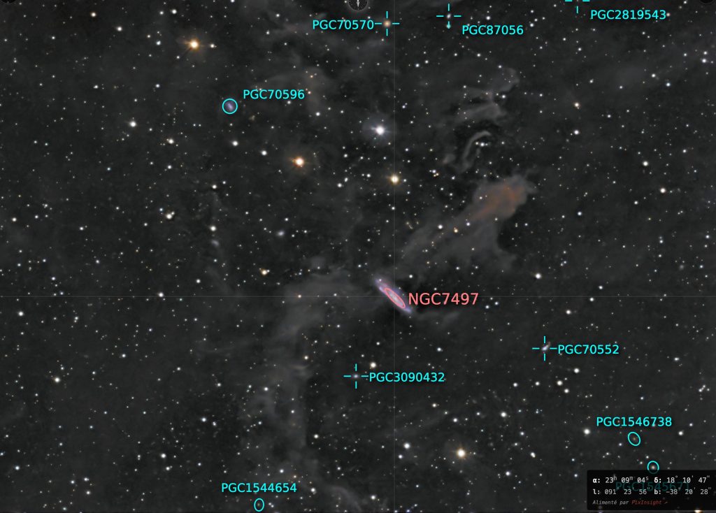 NGC 7497 est une galaxie spirale barrée cotonneuse située dans la constellation de Pégase. Sa vitesse par rapport au fond diffus cosmologique est de 1 344 ± 26 km/s, ce qui correspond à une distance de Hubble de 19,8 ± 1,4 Mpc (∼64,6 millions d’al). NGC 7497 a été découverte par l’astronome germano-britannique William Herschel en 1784.